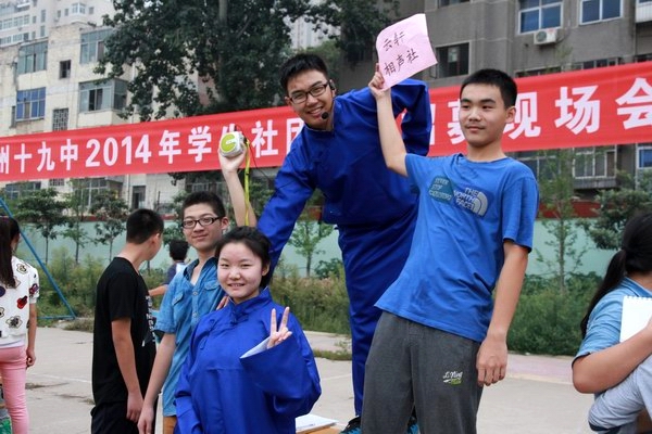 2014年9月10日下午,在郑州十九中校园广场上,远远地听见一名学生喊着:“这里是展示你青春舞台的阳光校园广播站,欢迎同学们报名!”其他同学也不甘示弱,身着动漫服饰,高高举着自己的海报,大喊:“欢迎加入世纪帝国动漫社!”原来,这里进行着学生社团集中招募现场会。学校共计20余个社团组织在学校组织下,进行着热烈有序地招募活动。