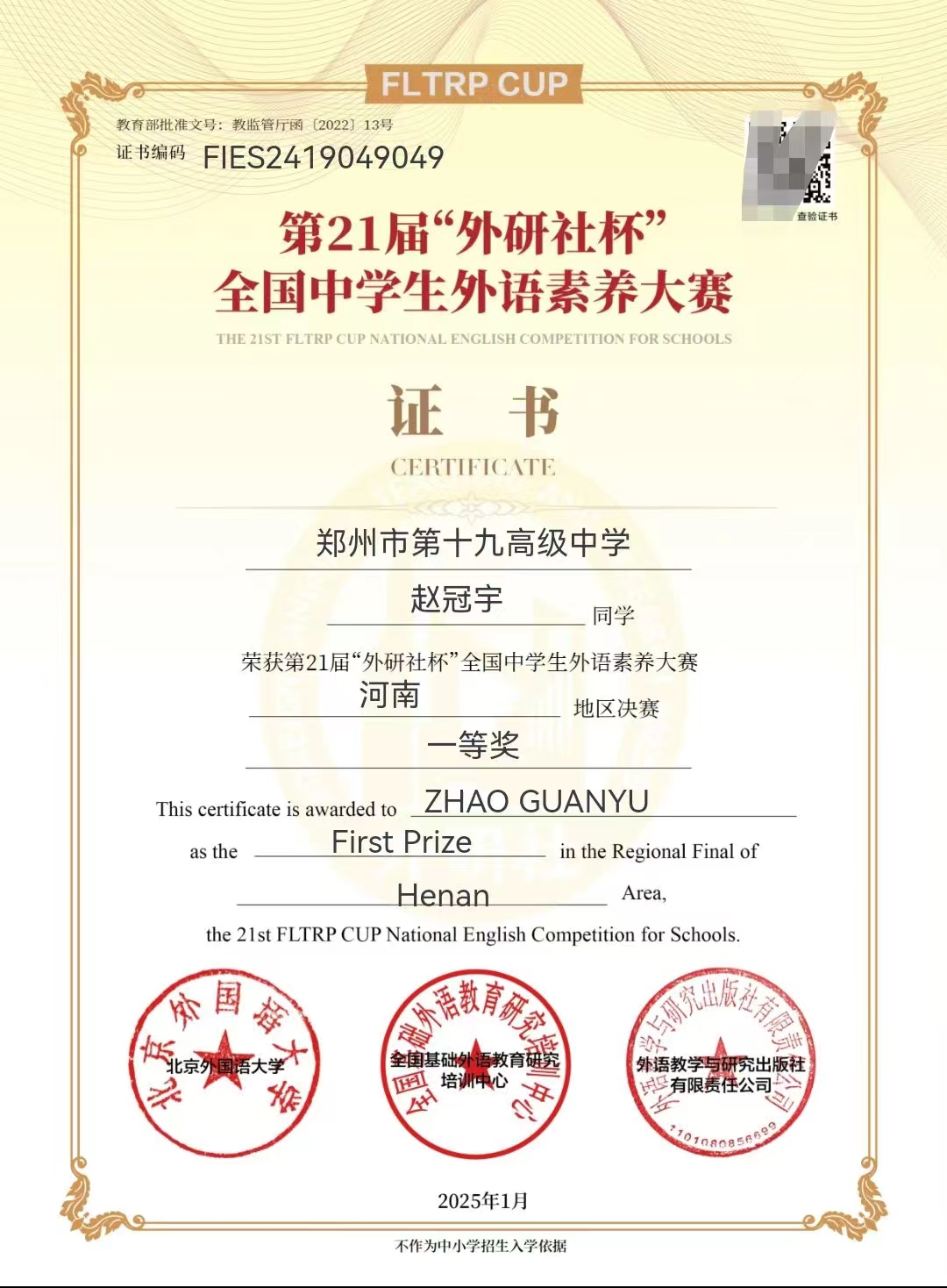 近日,由北京外国语大学主办、外语教学与研究出版社承办的第21届“外研社”杯全国中学生外语素养大赛成绩揭晓:郑州市第十九高级中学33人荣获省级一等奖,18人荣获省级二等奖,13人荣获省级三等奖!其中,高三(9)班李雯琪同学荣获省级一等奖并入围全国总决赛。