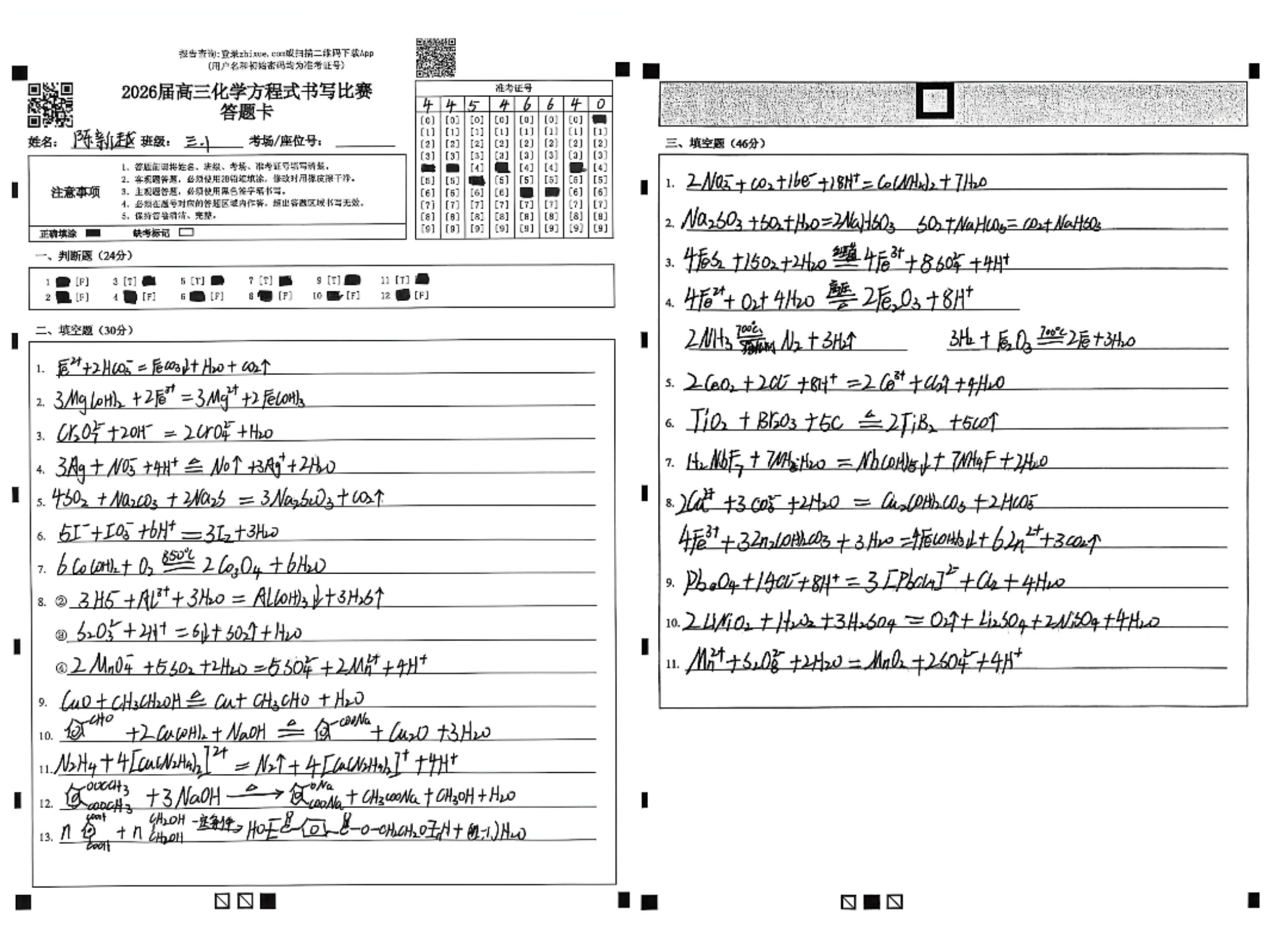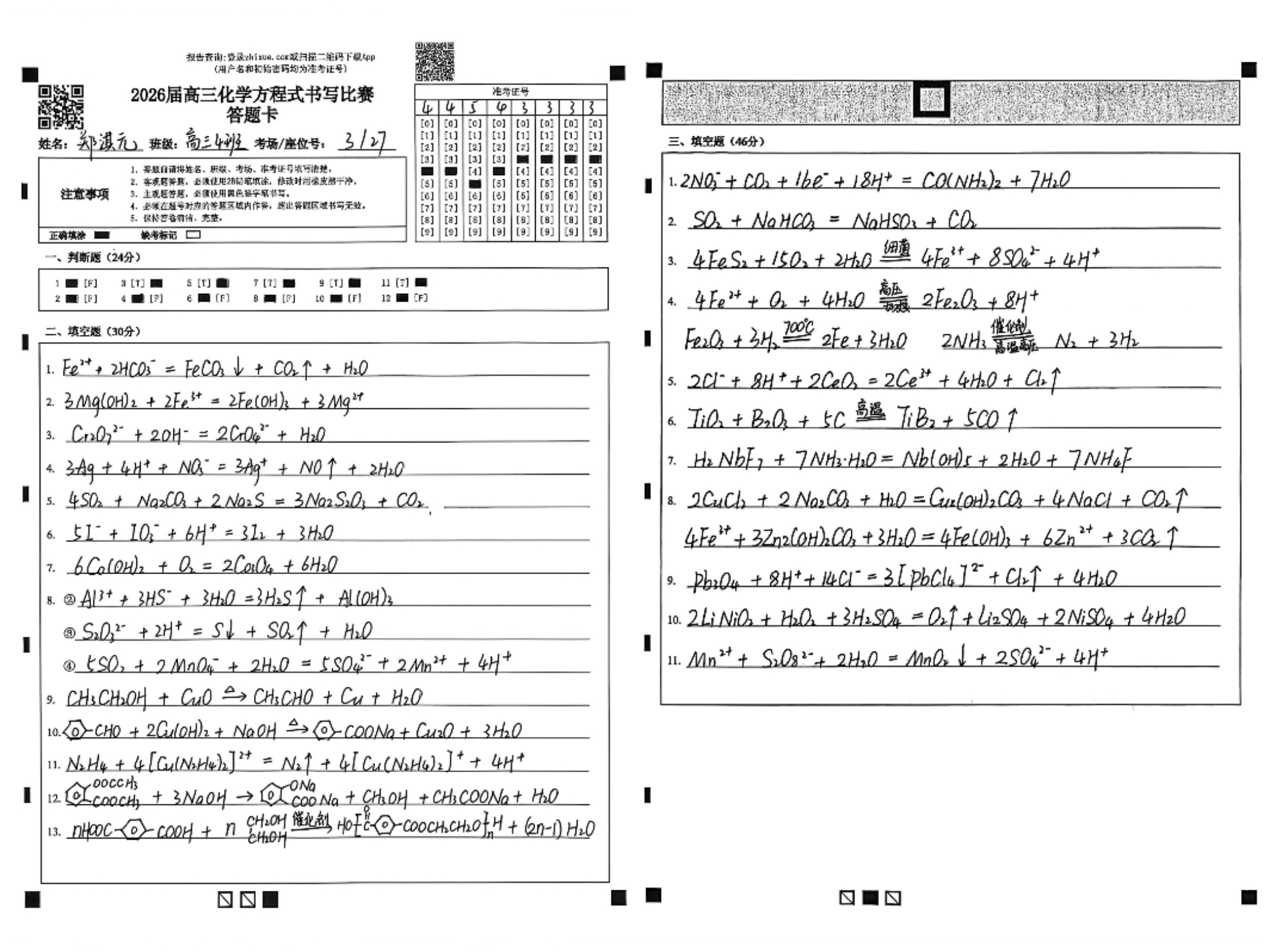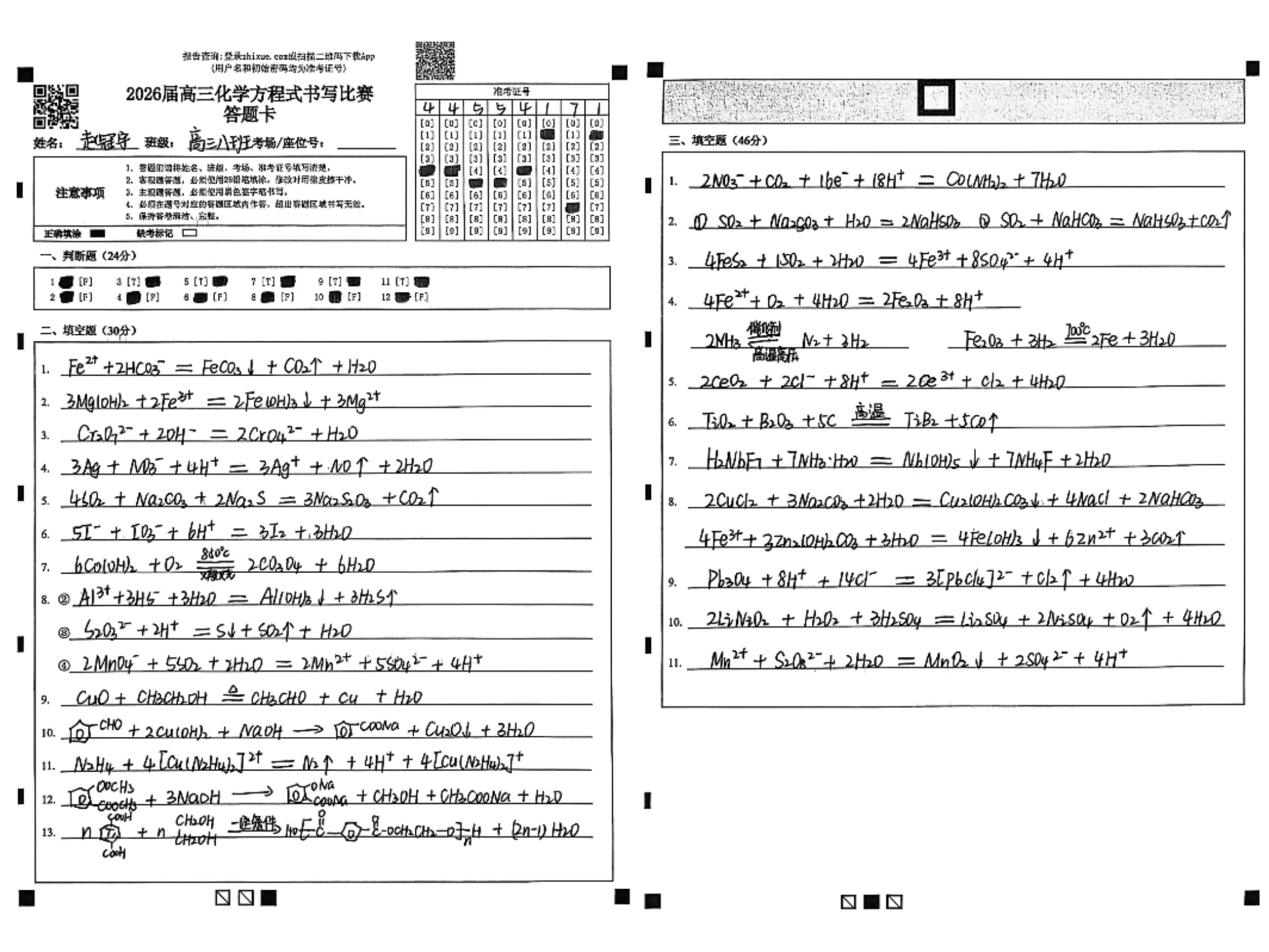 比赛现场,气氛紧张有序,学生们凝神书写,笔尖流动间,各类化学反应跃然纸上。从基础有机反应到复杂无机转化,从氧化还原配平到离子方程式书写,一个个方程式在限时中连贯而出,学生们展现出扎实的学科功底与清晰的思维脉络。这场笔尖上的“化学反应”,既检验了知识掌握的熟练度,也展现了他们在一轮复习中积累的底气与信心。