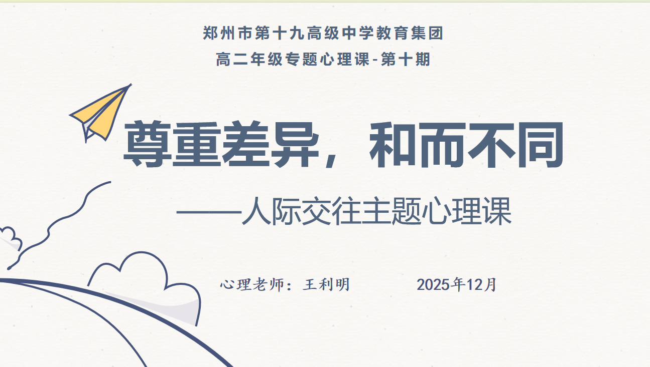系列心理课是郑州市第十九高级中学深入践行“立德树人,五育并举”理念、高度重视学生心理健康与健全人格培养的生动体现,也是学校构建校本化、优质化的心理健康课程的实际行动。学校将持续关注学生发展需求,不断优化心育课程体系,培养具备健全人格、良好社会情感能力与可持续发展力的新时代青年,为他们的终身发展与幸福人生奠基。