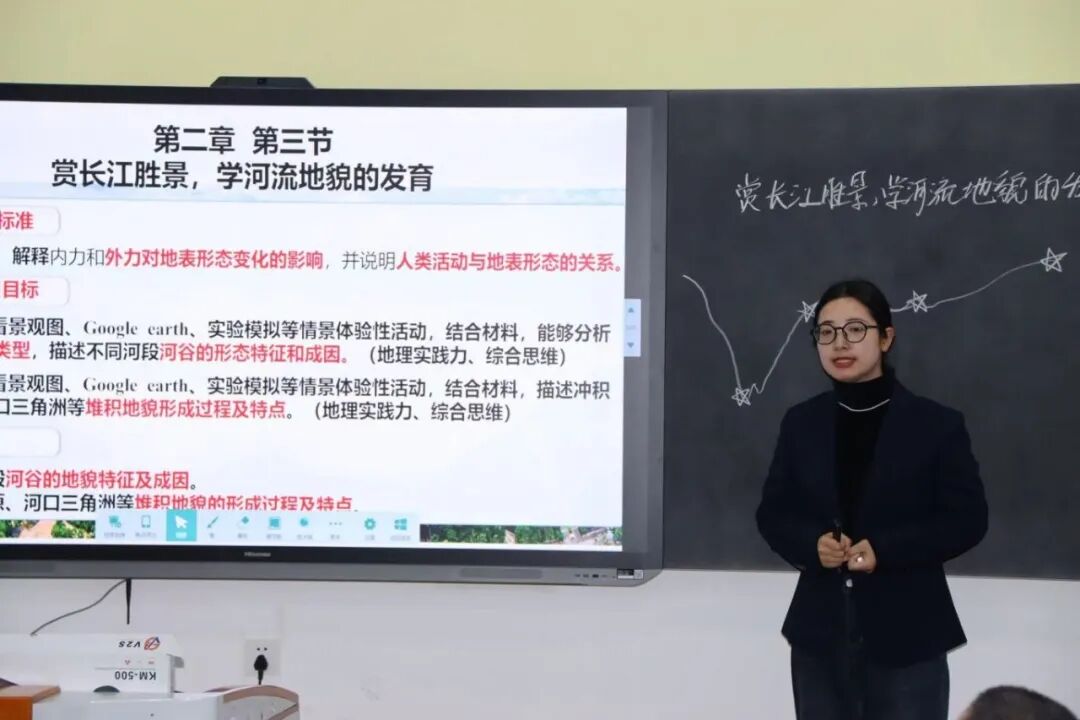 随后,七十四中杨艳妮老师以模拟课堂的形式,呈现了题为《赏长江之景,学习河流地貌的发育》的精彩课例。杨老师以长江流域为教学载体,精心选取虎跳峡、都江堰、荆江、崇明岛四大典型区域,从长江源头到入海口,引导学生循着地理景观的脉络,探究不同河段河流地貌的发育与演变机制。教学中,杨老师巧妙运用地理信息技术,展示长江地貌的形成过程,教学体系完整,紧扣课标要求,知识脉络清晰。同时,杨老师采用问题探究式课堂模式,通过层层递进的设问引导学生深度思考,习题设计紧密贴近现实生活,在培养学生区域认知、综合思维素养的同时,也强化了人地协调观的渗透。