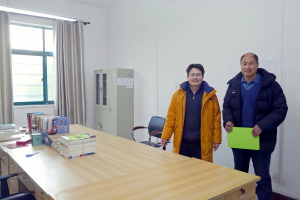 郑州市第十九高级中学工会负责人翟刚(右)检查办公室卫生