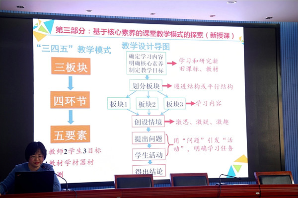 会议伊始,郑州市第十九高级中学彭俊老师作了题为《立德树人,培根铸魂,落实培养,启智润心》的报告。彭俊老师分三方面进行了交流,第一部分是本学期的教研计划,向各位老师展示了化学组各年级的教研日常;第二部分是教研组发展成果展示,彭俊老师为大家展示了郑州市第十九高级中学化学组近五年的公开课、课题及竞赛成果。在第三部分,彭俊老师向大家分享了新授课基于核心素养的教学模式探索,并结合具体的课给大家展示了自己独创的“三四五”教学模式,即三模块,四环节,五要素。整场交流干货满满,给大家对新授课模式的探索提出了新的思考。