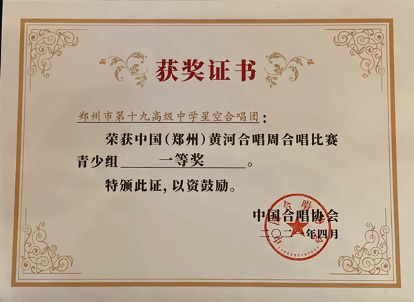 4月27日,由中共河南省委宣传部、河南省文化和旅游厅、郑州市人民政府、中国合唱协会主办,中共郑州市委宣传部、郑州市惠济区人民政府承办的中国(郑州)黄河合唱周活动落下帷幕,郑州市第十九高级中学星空合唱团一举斩获了青少组一等奖、优秀指挥奖、优秀钢琴伴奏奖等多个奖项。
