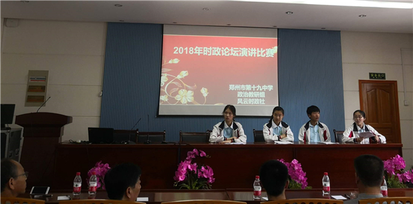 为促进高中学生了解时政,关注时政的热情,提高同学们对时政的分析能力,发表自己对热点时政的观点。2018年5月7日,由郑州市高中政治第一教研共同体主办,郑州市第十九中学承办的第五届时政论坛演讲比赛在郑州市第十九中学西会议室召开。郑州市第十九中学政治教研组和高二20班学生李子涵、郑州一中、24中、16中的带队老师及参赛学生参加了此次活动。