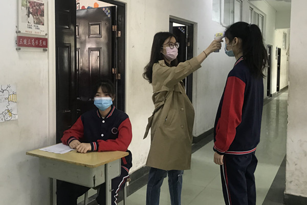 学生到达班级后,班主任在教室门口手持红外线测温仪对学生体温进行二次测量,班长对学生体温进行登记。同学们入班后按照座次表核对桌子上的姓名,无误后就座,保持安全距离。此外,学校还利用LED显示屏、宣传栏宣传校园疫情防控知识,在醒目位置张贴校园疫情防控知识。
