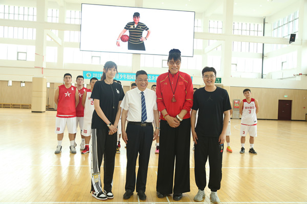 副校长王勇(左一)、副校长张浩(右一)与著名女篮中锋郑海霞合影留念