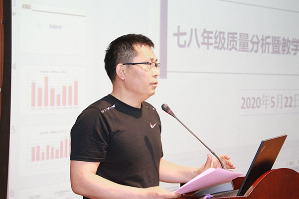 接着,七年级年级长孙云龙、八年级年级长路艳超分别对本年级考试成绩进行了通报和分析,分别对疫情期间老师们的线上教学工作表示肯定,并针对本年级的具体情况提出了下一阶段工作的具体改进措施,强调接下来的教学工作要注意归纳整合,培优补差;务实基础,注重效率;落实要求,分层突破。