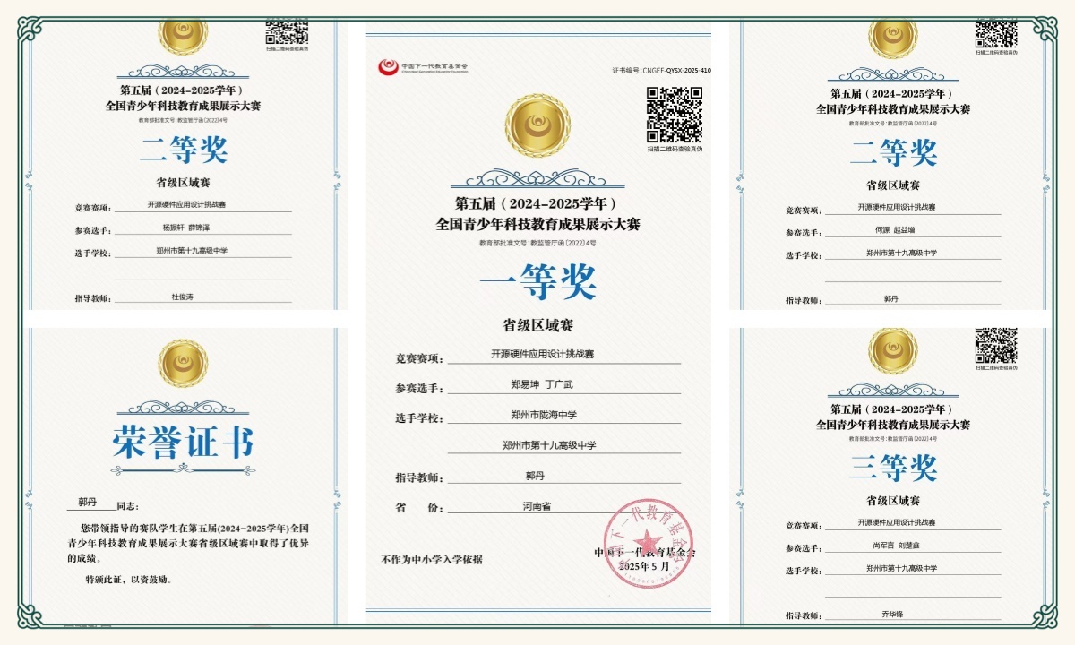 近日,第五届全国青少年科技教育成果展示大赛(全国青科赛)河南省区域赛圆满收官。郑州市第十九高级中学教育集团4支参赛队伍凭借卓越的创新实践能力,在全省10563支队伍、11297名选手中脱颖而出,一举斩获河南省区域赛一等奖1 项(晋级国赛)、二等奖2项、三等奖1项的优异成绩,为学校科创教育再添浓墨重彩的一笔。