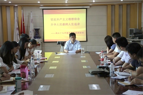 2016年8月13日上午,在郑州市第十九中学新进教师岗前培训课程中,学校党委陈绍营书记为2016年新入职的青年教师详细介绍了学校党委的工作机能及党建工作特色,以便新进教师尽快了解情况,方便学习工作和生活。