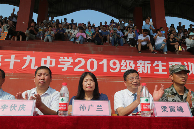 上午九点, 2019级新生军训成果汇报表演暨闭营仪式在庄严的国歌声中正式开始。随后,该校党委书记、校长梁寅峰在军训总教官的陪同下开始检阅各班方阵。“校长好”、“为校争光”的呼声此起彼伏,表达了同学们对校长的尊敬和对学校的热爱。伴随着雄壮激昂的分列式进行曲,各方队进行分列式汇报表演,受训新生英姿飒爽,精神抖擞,喊着嘹亮的口号,迈着整齐划一、铿锵有力的步伐通过主席台,接受与会领导的检阅,展现出了郑州19中学子奋发向上、积极进取的精神风貌。分列式表演结束后,高中部女子特色方队和初中部手语操表演方队分别进行了精彩的汇报表演,表现出巾帼不让须眉的豪情壮志;高中部男子军体拳表演方队出拳虎虎生威,踢腿坚毅有力,彰显出男儿当自强的英雄本色。在汇报表演过程中,看台爆发出一阵阵热烈的掌声。