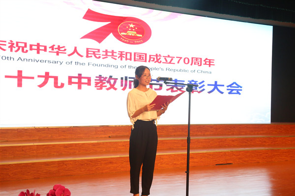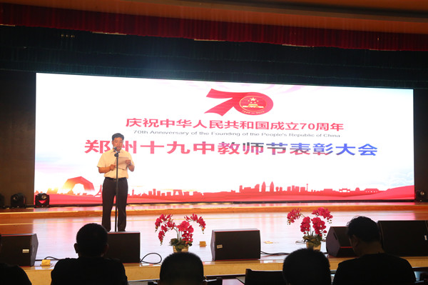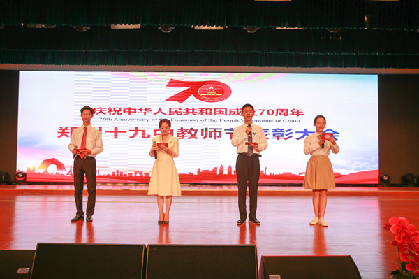 在庄严的国歌声中,表彰大会拉开帷幕。首先由学生代表李晓旭、陈子欣向教师节献词,颂扬诲人不倦的精神,歌颂情深似海的师恩。副校长王勇宣读《关于表彰2018—2019学年先进集体和先进个人的决定》。本次表彰共设置“优秀教师”、“优秀班主任”、“优秀教育工作者”、“优秀党员”、“优秀教研组”等奖项。随后,副校长张浩宣读了2019年新进教师师徒结对名单,并对指导教师和青年教师提出了具体的要求。学校领导干部现场为指导教师颁发聘任证书,同时青年教师向师父献花并行拜师礼。作为师傅代表,校元明老师表示将毫无保留地把经验传授给青年教师,从高从严地要求徒弟,使他们早日成为一名优秀的教师。最后,郑州市第十九中学星空合唱团的同学们为全体教职工献上一首《明天你好》,感动你我。