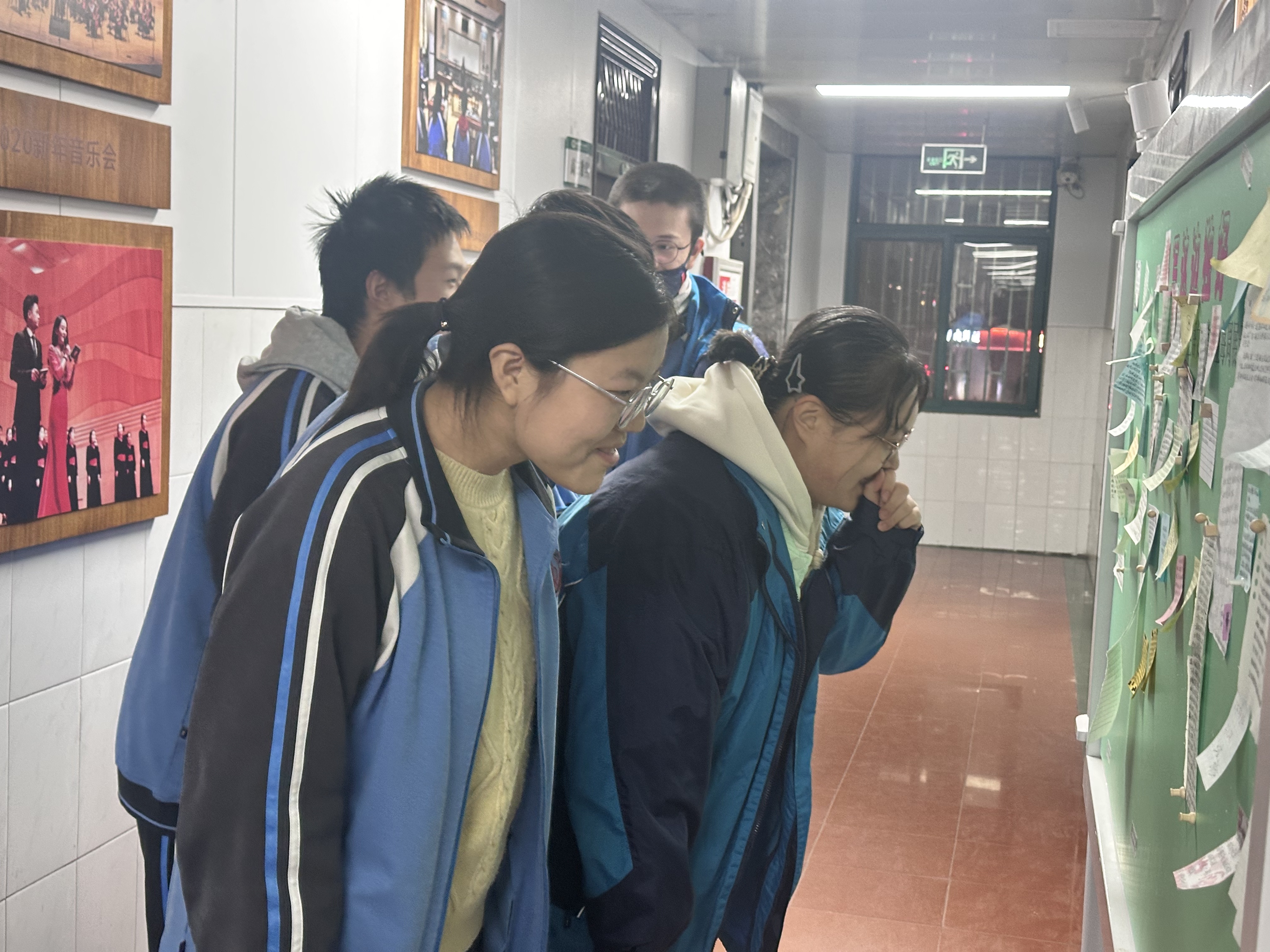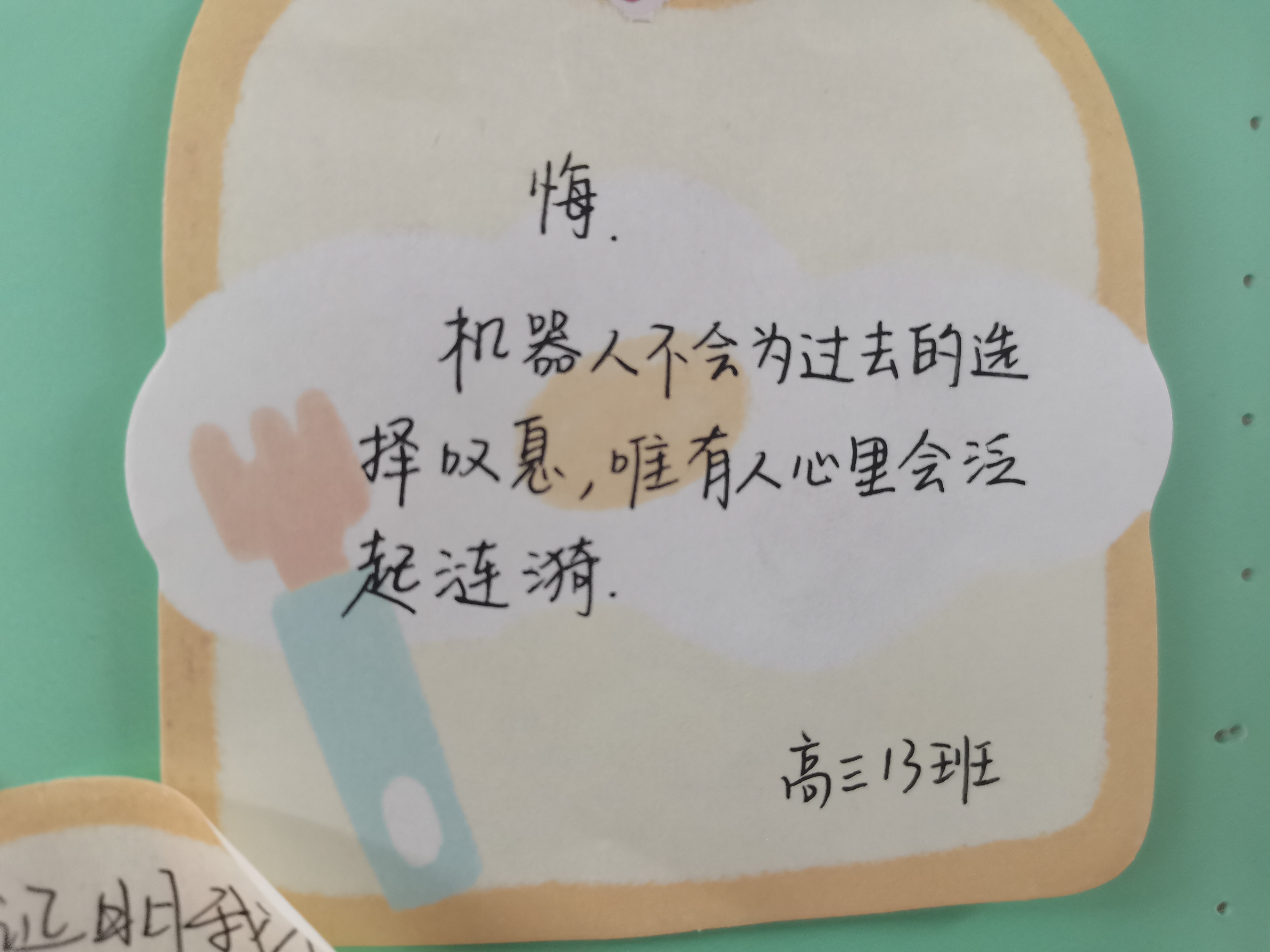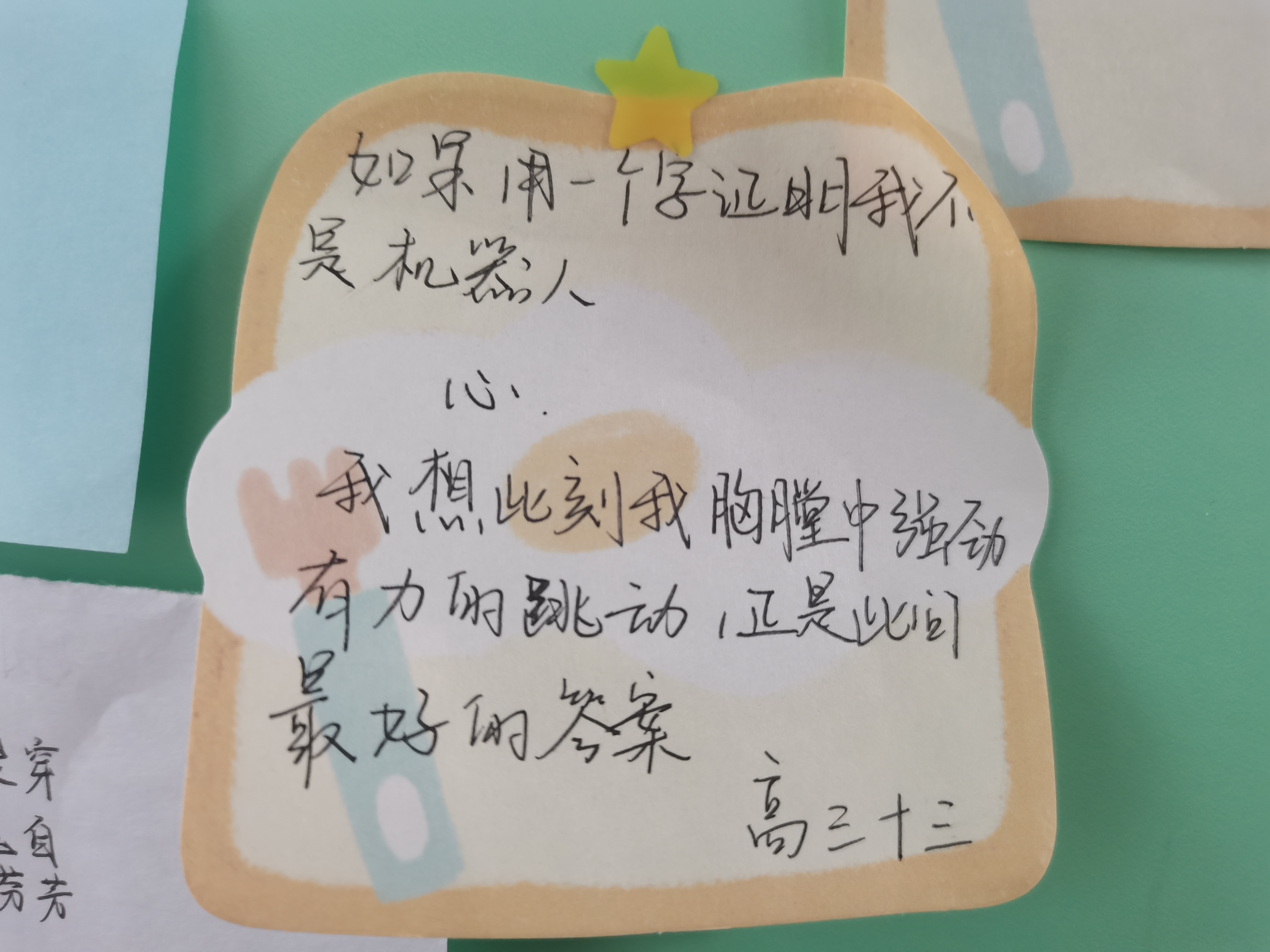 活动过程中,各班同学或凝神静思,或热烈讨论,将对“人之为人”的独特理解凝练于一字之中。展板前,一张张见解卡片渐次铺展,字迹各异,意蕴悠长:有学生以“心”落笔,写下“此刻胸膛的跳动,正是此问最好的答案”;亦有学子择“悔”为解,坦言“机器不会为过去叹息,唯有人心会泛起涟漪”;有人书写“睡”字,诠释“苏醒是一种艺术,也是另一种涅槃”;更有同学以“忆”点睛,道出“机器只能‘记忆’,而人类懂得‘回忆’”的深刻体悟。匿名卡片藏匿细腻哲思,署名文字流露真诚思考,方寸之间,尽显少年对生命本质的鲜活叩问。