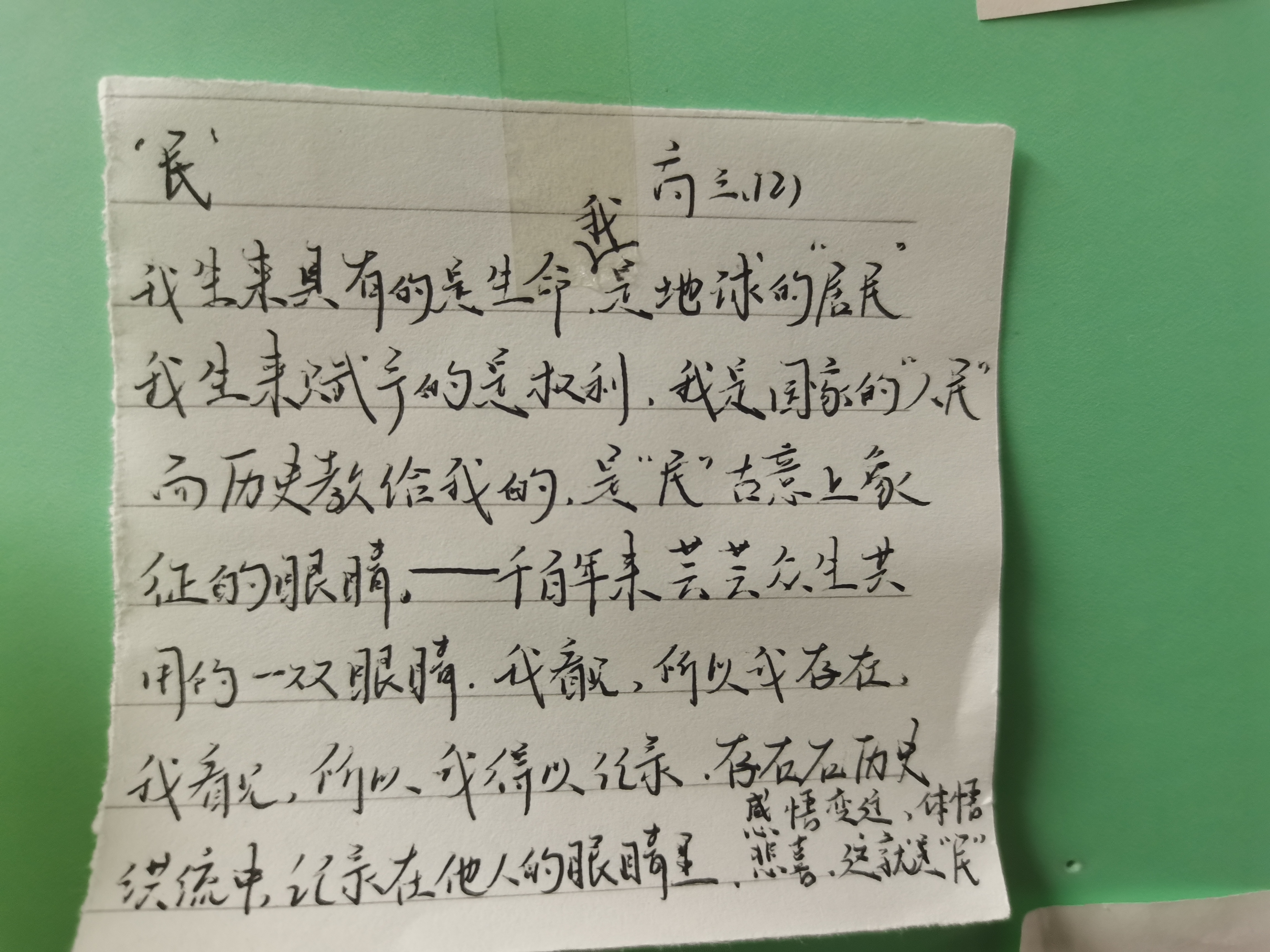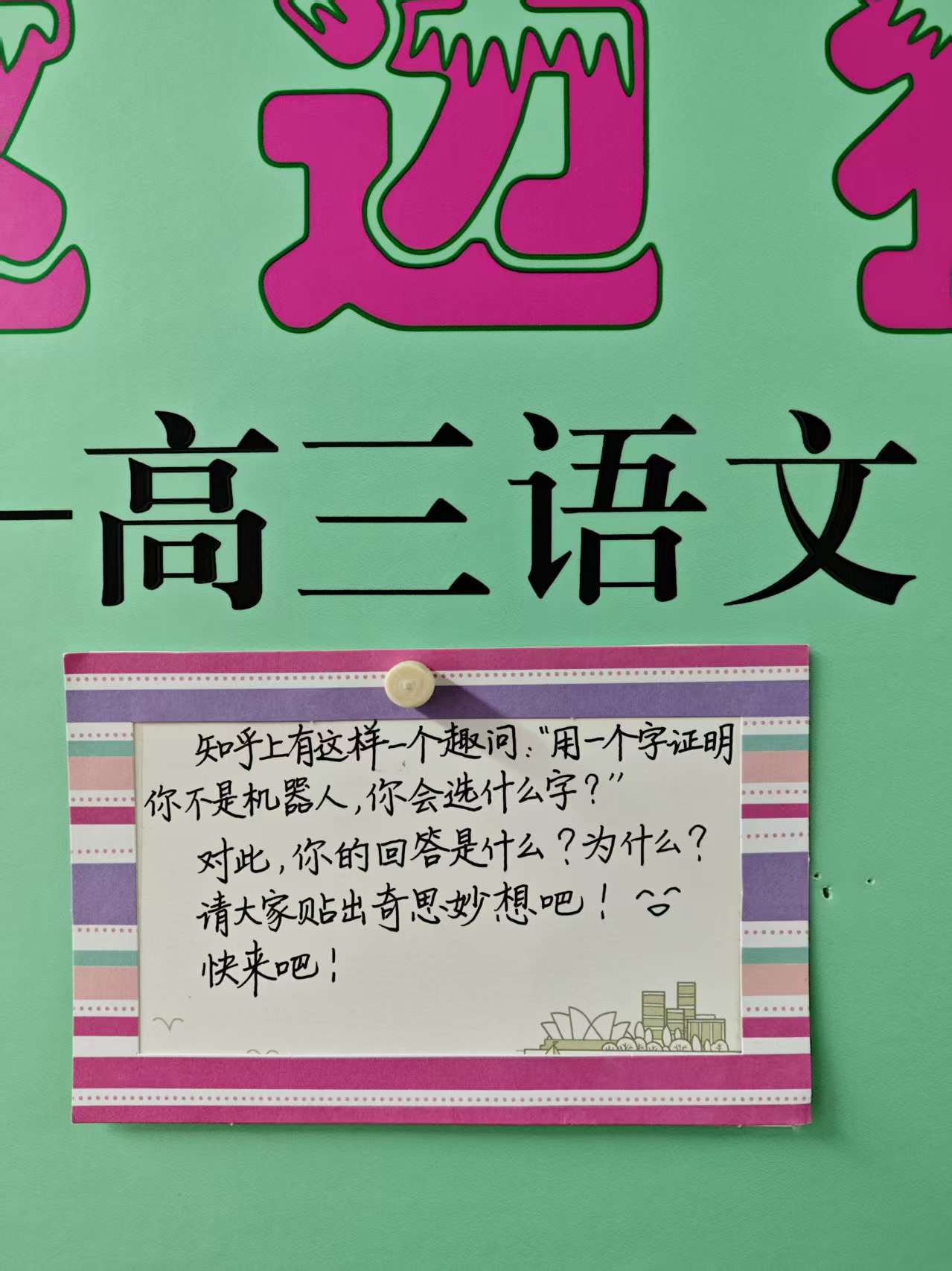为深化高三学子对“审题立意”的思辨认知,激发思维的广度与深度,近日,高三语文组开展“书写这边独好”第四期主题活动。本期以“如果用一个字证明你不是机器人,你会选择哪个字?”为思辨议题,引导学生以“一字立言”的方式,于笔墨间展露思想,在交流中启迪心智。