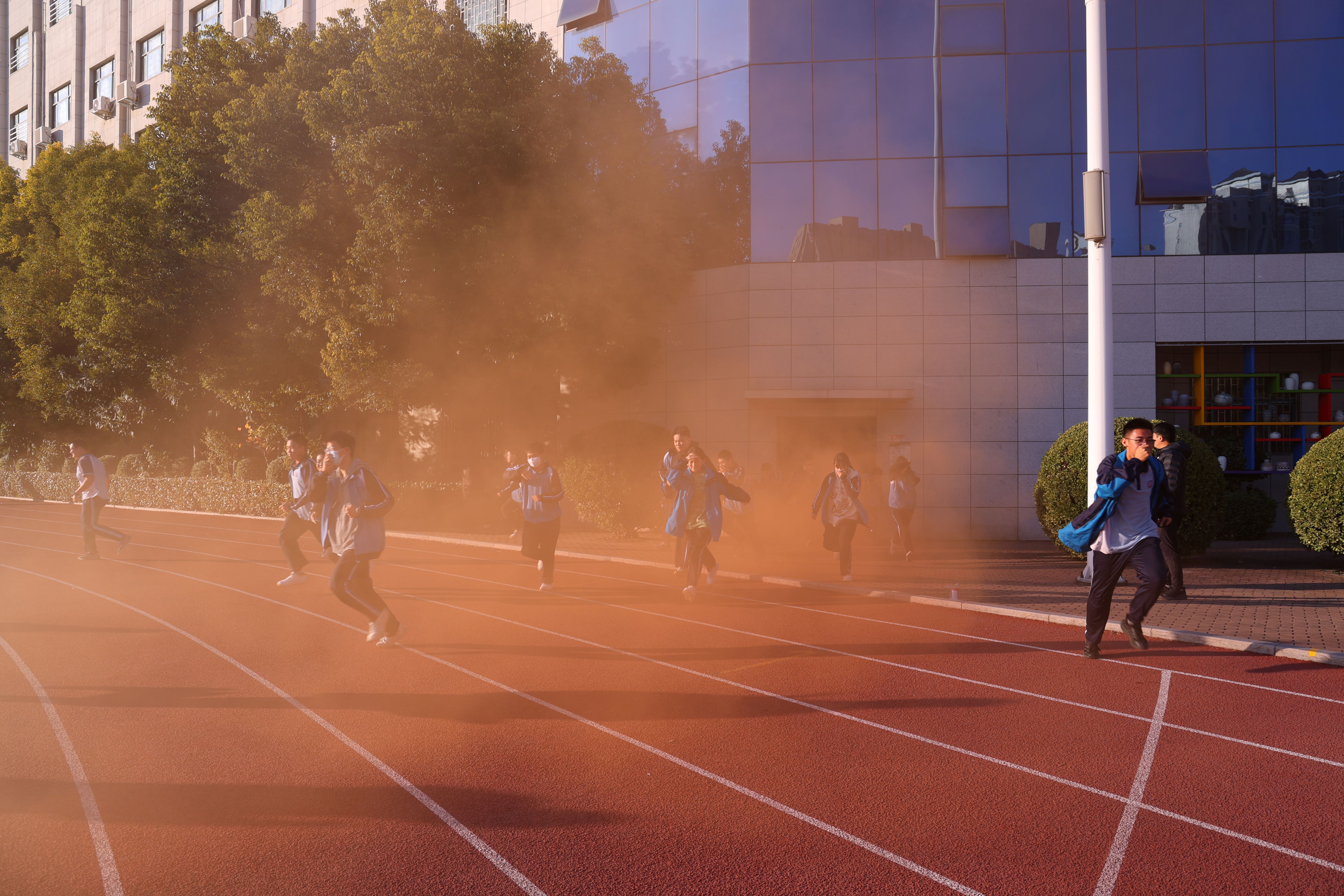 下午16:00,警报声准时响起,演练正式启动。楼内引导员迅速就位,陈静、马琨然等老师用规范手势和清晰指令,引导学生弯腰捂鼻、低姿有序撤离,严禁打闹跑跳。楼外出口处,老师精准施放烟雾,模拟真实火灾场景。学生们从三个出口快速撤离,在老师引导下分区列队,高效完成人数统计,短短3分钟内全体师生安全集结操场。