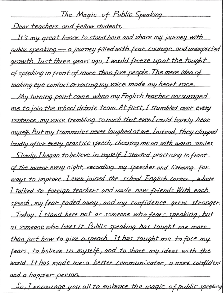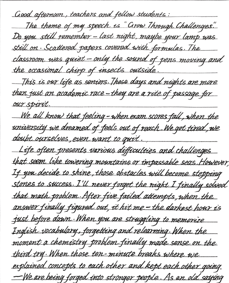 本期比赛以“Grow Through Challenges(历经挑战,茁壮成长)”为主题,与读后续写中“困难、挫折、成长”内核高度契合。舞台上,选手们褪去青涩,带着满满的真诚与深刻感悟登台:标准流畅的发音传递着直面挑战的勇气,饱含感染力的语调牵动着每一位听众的心弦,生动自然的肢体语言让成长故事更具画面感。他们分享着自己与困境周旋的坚持、在挫折中汲取力量的觉醒、以及在突破中收获蜕变的喜悦。