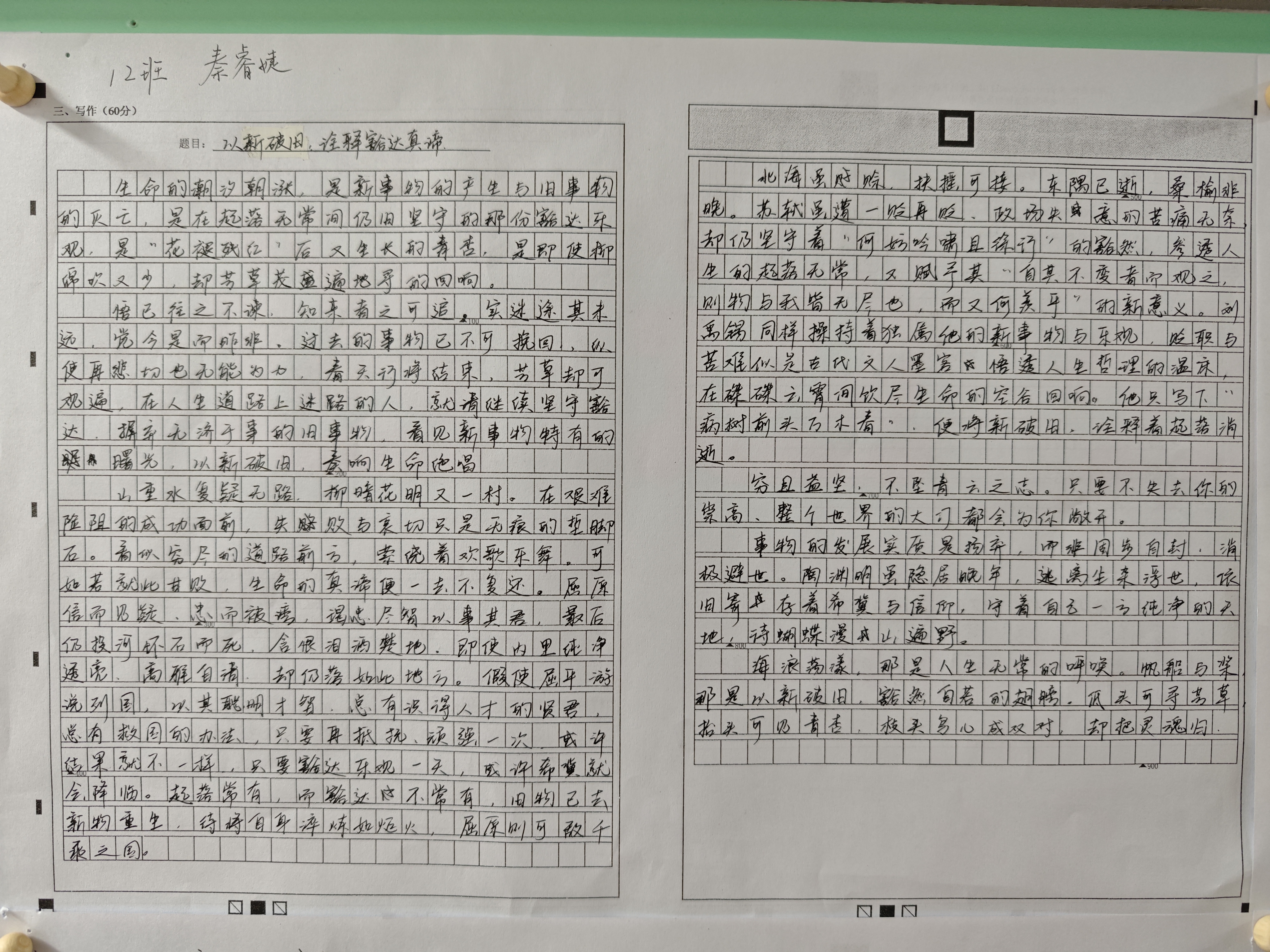 规范书写不仅是考试的基本要求,更是文化传承与个人修养的重要体现。本次周考作文展将“规范书写”与“深度思考”相融合,引导学生在形式与内涵上同步提升语文综合素养。希望通过此次展示,同学们能在观摩交流中相互借鉴、取长补短,进一步激发“见贤思齐”的内在动力。