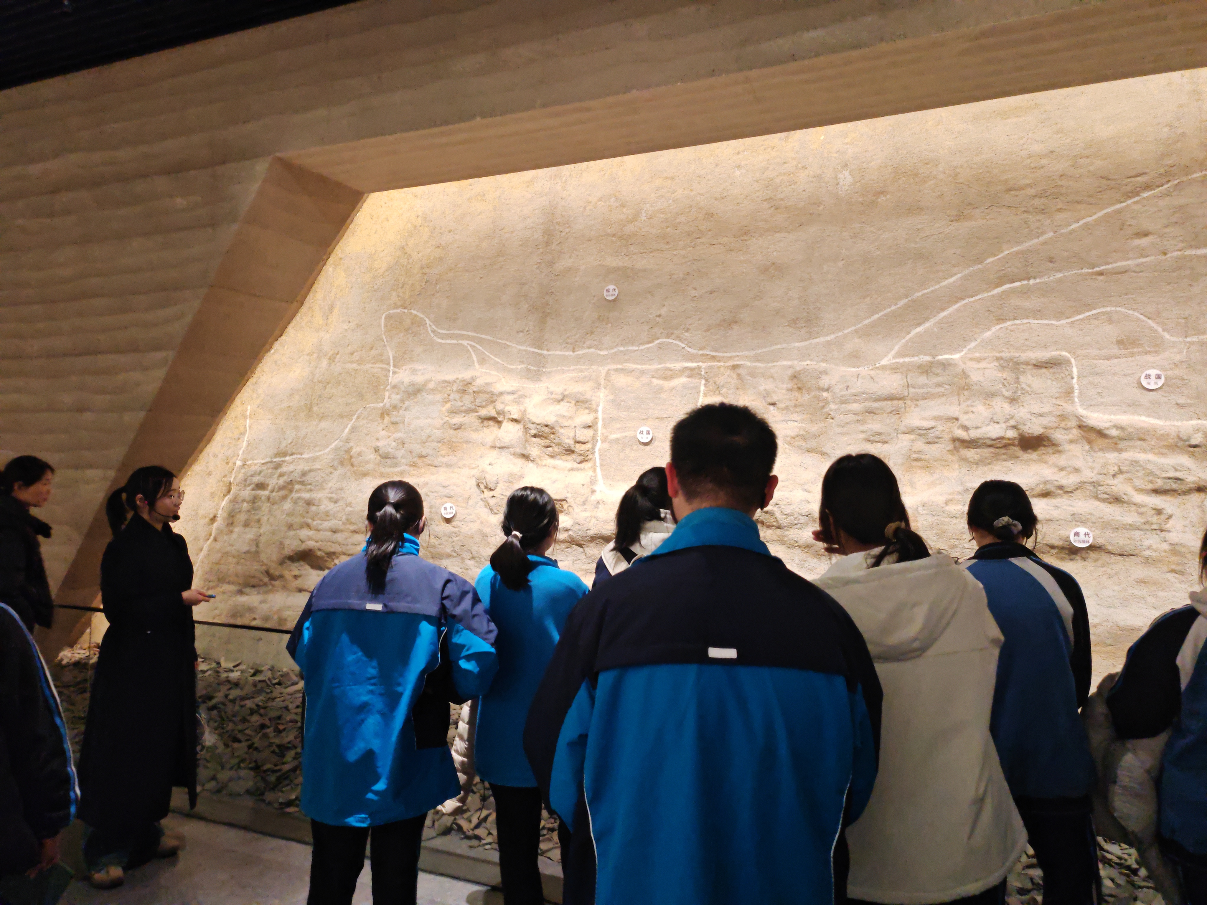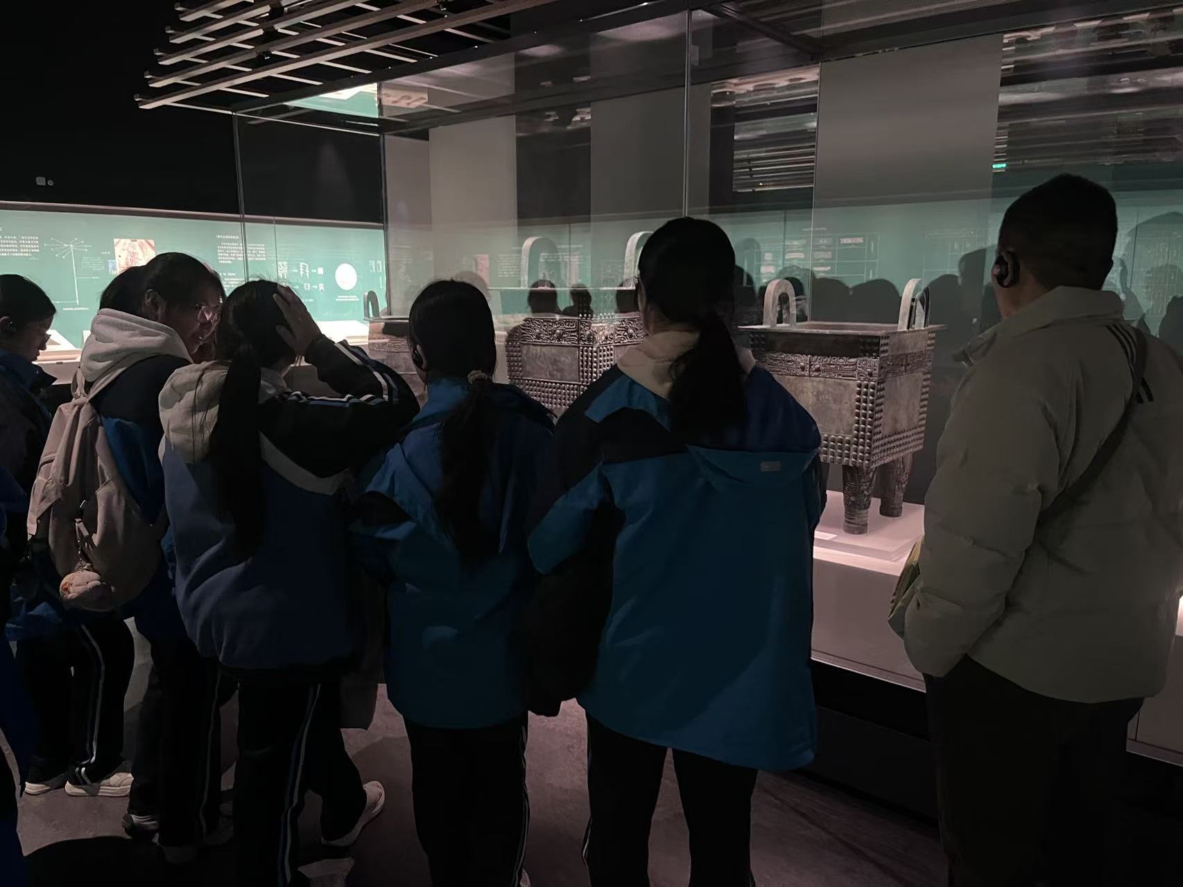郑州商都遗址博物院展厅面积约5500平方米,基本陈列“巍巍亳都 王都典范——郑州商代都城文明展”,分为文明摇篮、玄鸟生商、巍巍商都、大邑商都、四方之极、生生不息、守望保护七个单元。从出土的青铜礼器、玉器、陶器到都城布局沙盘、宫殿复原模型,一件件文物、一幅幅图景生动再现了商代早期的社会风貌、礼仪制度与工艺水平。在镇馆之宝 “杜岭方鼎” 前,讲解员详细介绍了其铸造工艺与历史价值,同学们驻足凝视,惊叹于先民的智慧与创造力,纷纷就文物背后的历史背景、考古发现等问题与老师、讲解员展开热烈讨论。