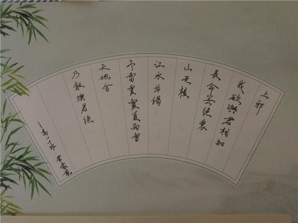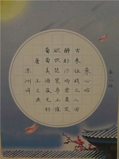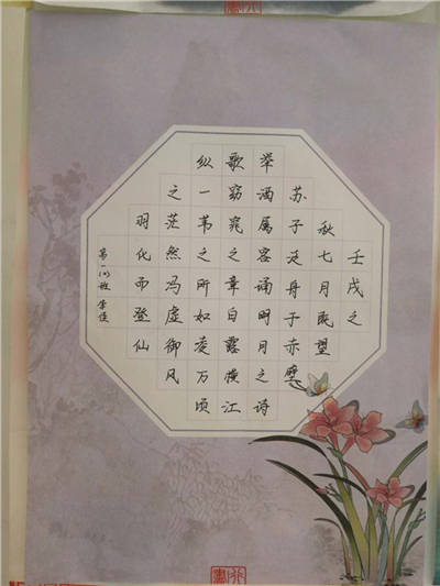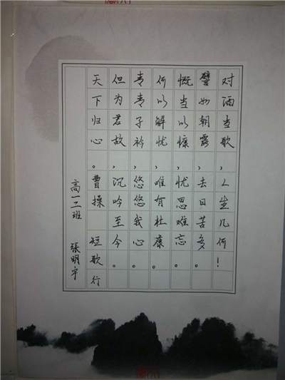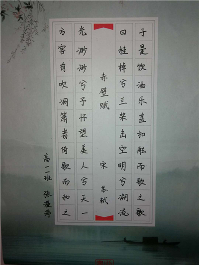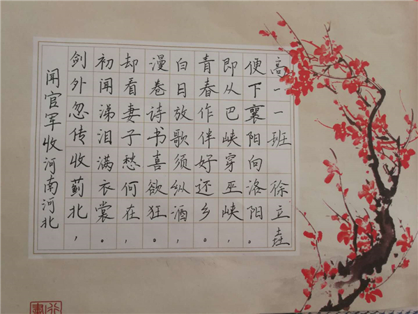 12月7日下午,由语文老师邀请的专业书法老师,从这一百五十多份决赛作品中精选出来10个一等奖,20个二等奖,30个三等奖,颁发证书和奖品,并将作品在宣传栏里展出。明月高悬,夜色凝重,在这初冬的寒夜里,这些作品却散发着耀眼的光芒。传统诗词和书法的完美结合,给全校师生带来了一场精彩的视觉盛宴。观赏的同时,也让人不觉嗅到那股清新、淡雅、香醇的书墨之香,给繁忙的学习生活带来一缕舒爽。