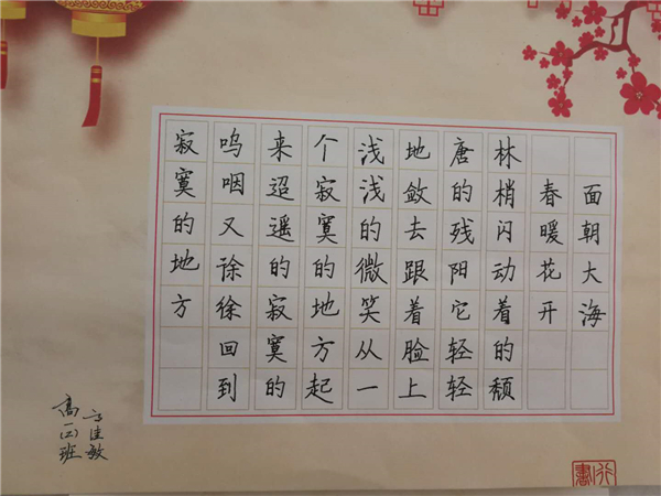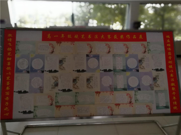 近日,在郑州十九中大学堂一楼大厅,一道靓丽的风景线吸引了每一位过往的师生,参观的人群中还不时发出啧啧的称赞声,原来这里正在展出高一年级硬笔书法比赛的优秀作品。
