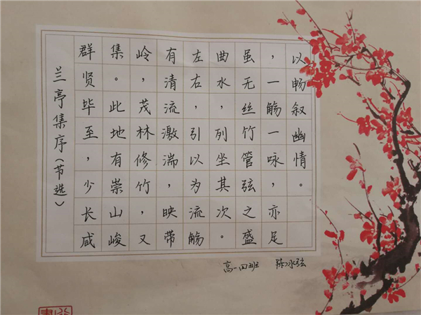 本次大赛分为初赛和决赛两部分,前期在老师们的宣传鼓动下,同学们早已胸有成竹,跃跃欲试。初赛时间是12月5日,在各班举行。当拿到参赛纸的那一刻,同学们都推开了繁重的作业,一个个坐得笔直,屏气凝神地投入书写,朝气蓬勃的脸上挂着自信的微笑,认真从容,心气平和,指尖跃动,在纸上画出优美的痕迹。有的字端正秀气,提按分明;有的舒展大方,运笔流畅;有的虽不算很好,但是工整书写,尽了最大努力,大家都希望能从班级里脱颖而出。初赛作品完成后,经过老师和同学们的认真筛选,各班推选出八名优秀代表参加年级决赛。