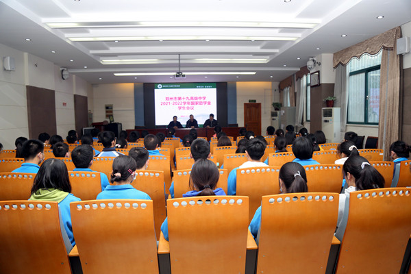 11月30日,郑州市第十九高级中学举行2021-2022学年国家助学金学生会议,全校60余名贫困生到场参会,学校纪委书记郭中喜、政教处主任潘冠华、政教员赵林参加会议。
