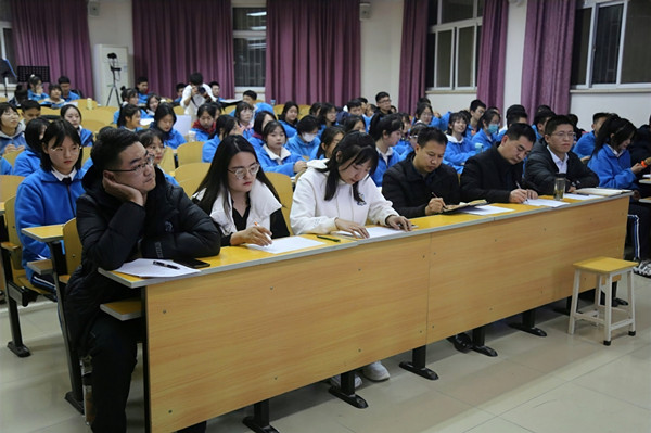 班主任李秀娟(前排左一)、王超(前排左二)专注观看主题班会