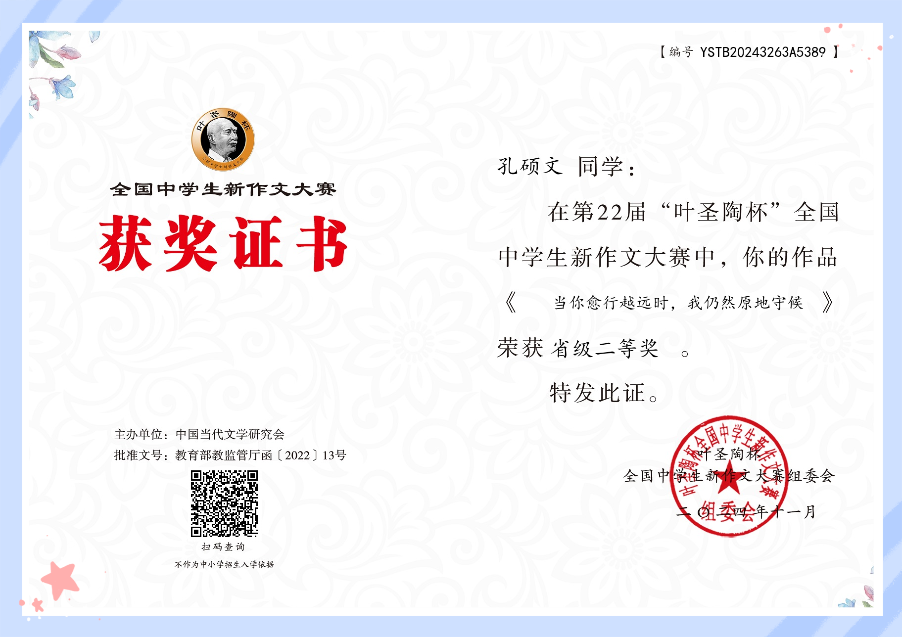 叶圣陶杯全国中学生新作文大赛是教育部白名单赛事之一。大赛以“弘扬叶圣陶教育思想,助力语文新课程改革,引领中学生健康写作,发现与培养文学新苗”为宗旨,服务于“立德树人”教育根本任务。